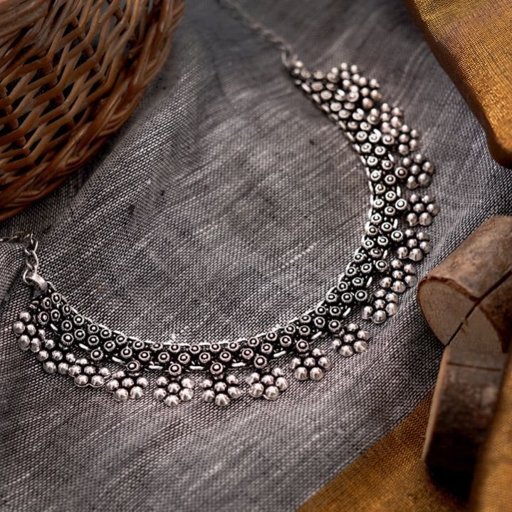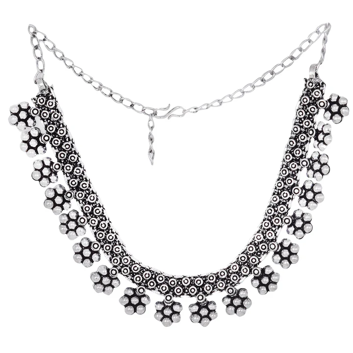 Praanvi Silver Oxidised Choker Necklace is pretty and reflects distinct floral aesthetics and recreates opulence in german silver for a more wearable. This choker necklace will complement your occasion-specific styling effortlessly and will help you achieve #FashionGoals!